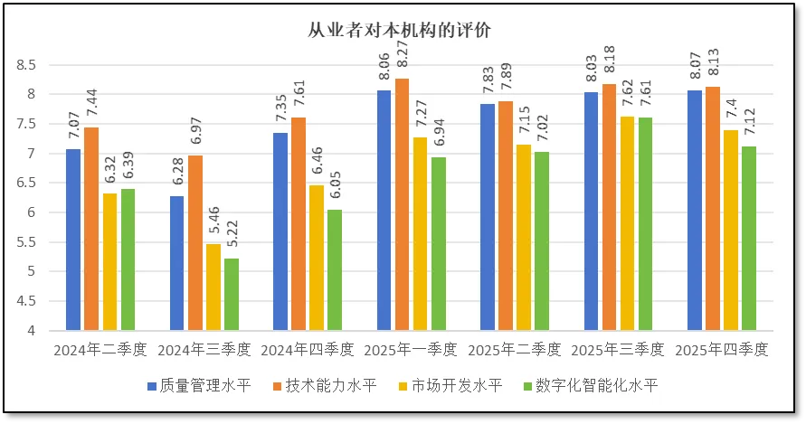 由上两图可见,在四季度末,从业者们对本机构的“质量管理水平”打分为8.07分,对“技术能力水平”打分为8.13分,对“市场开发水平”打分7.4分,对“数字化智能化水平”打分为7.12分。从这些数据来看,除了质量管理水平指标还略有增长外,其余三个指标均比三季度略低,说明从业者们除了认为本机构的质量管理水平仍稳中有升,保持在良好状态之外,对于本机构的技术能力、市场水平以及数字化水平发展情况均存在略不满意的情况。