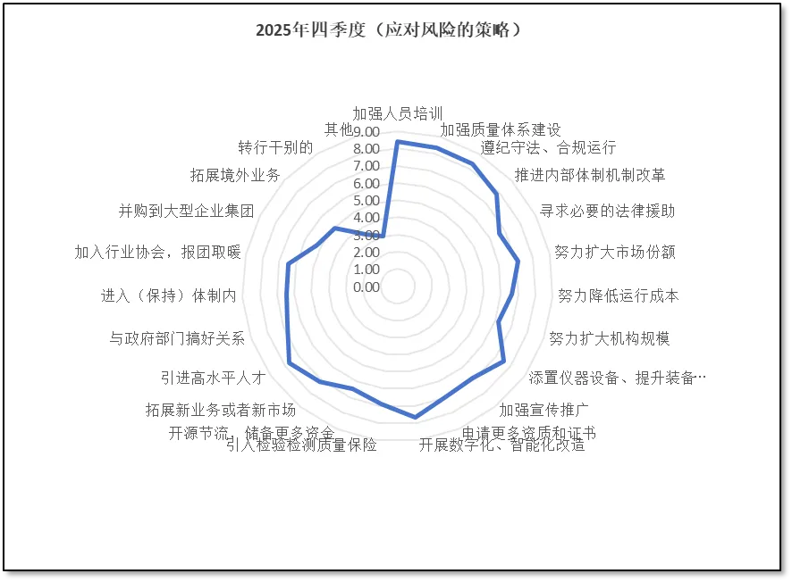 在如何应对检验检测行业发展的风险方面,2025年4季度末,从业者们打出的分值如下面三张图所示。