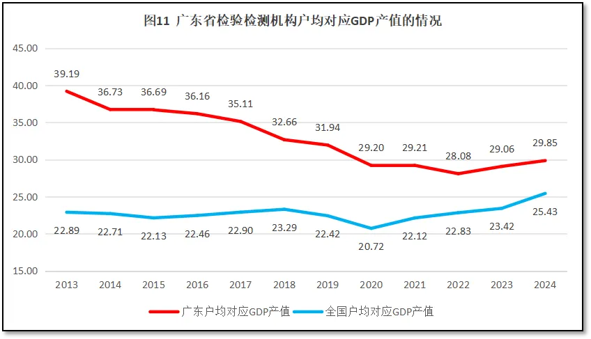 广东省2024年度地区生产总值(GDP值)141634亿元,全国排名第一。不过,广东省4745家检验检测机构,户均对应的GDP值为29.85亿元,虽然比全国平均水平的25.43亿元高出4.42亿元,但排名仍维持在全国第8(按照从高到低排序)。这在一定程度上说明,广东省的检验检测机构虽然规模大、实力强,且仍保持增长,但与广东省经济体量相比仍处于适配区间,还存在一定的增长余地。过去12年广东省检验检测机构户均对应的GDP值与全国的情况比较如图11所示。