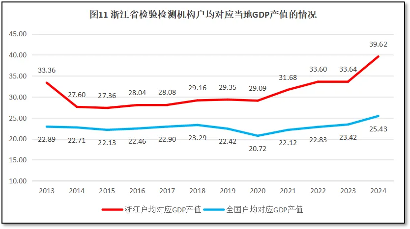 由图11可见,过去12年,浙江省检验检测机构户均对应的GDP值出现了先降后升的变化趋势,在2015年下降到27亿元左右后逐步增长,到2024年度达到39.62亿元。从浙江省户均对应GDP的值与全国情况进行比较可见,两者的变化规律近似相似,但浙江省的数值一直比全国平均数要高,近年来高得更多,差距还进一步拉大,说明浙江省区域经济发达,当地经济增长率走在了检验检测行业发展速度之前。