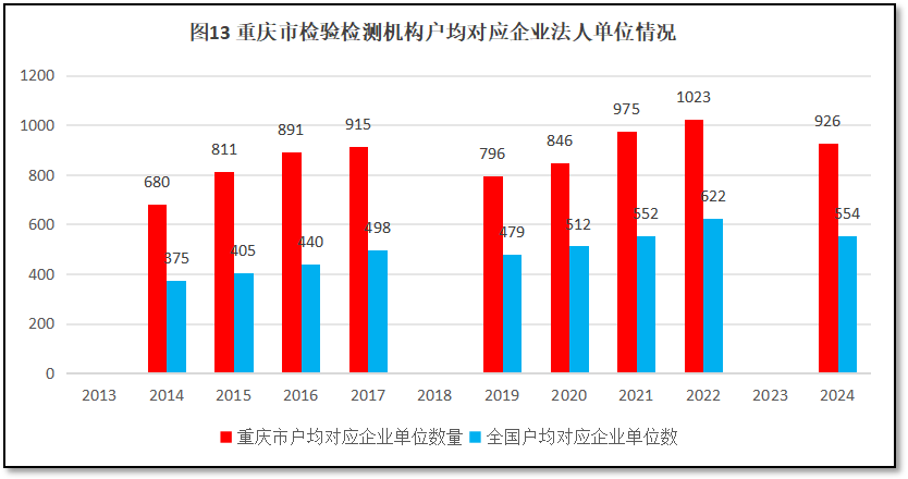 由图13可见,12年来,重庆市检验检测机构户均对应的企业法人单位数量是逐年上升的,且一直远高于全国平均数。2024年重庆市检验检测机构户均对应企业法人单位926个,比全国平均数554个高出372个。以2024年度的统计数据计,重庆市地区企业法人单位数量超过66.2万个,位居全国第16位(较2023年度排名提升2位),排名比重庆市检验检测机构数量的全国排名靠前。这说明,对于重庆市的企业法人单位数量来说,重庆市地区检验检测机构数量也不算多,有利于保持重庆市检验检测市场的增长空间。