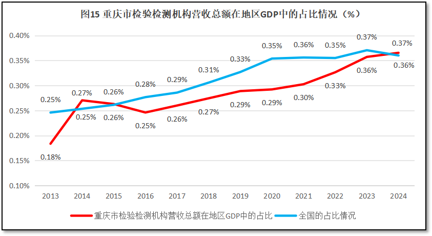 再来看重庆市检验检测机构营收总额在其地区生产总值GDP中的占比情况。2024年度,重庆市检验检测机构营收总额117.61亿元,占当年重庆市GDP值的0.37%,几乎与2024年全国占比平均值(0.36%)一样,排名全国第12位(较2023年度排名下降1位)。过去12年重庆市检验检测机构营收总额在当地GDP值的比例变化情况如图15所示。