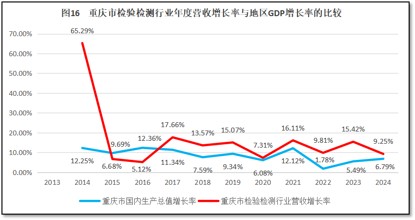 从图15可见,重庆市检验检测机构营收总额在当地GDP中的占比增长较快,多数年份占比数值微微低于全国平均数,但差距不大。2024年重庆市检验检测机构营收总额略微超出全国平均数,这说明重庆市检验检测行业的发展对于重庆市的经济直接贡献较大,地位十分重要。重庆作为西南地区的经济中心之一,发展速度快、经济总量高,检验检测行业的发展契合重庆市的城市定位,因此重庆市政府也高度重视检验检测行业的发展,推动着重庆检验检测机构持续快速前进。