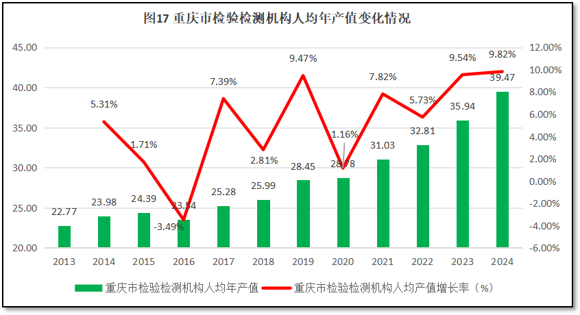 由图17可见,重庆市检验检测机构人均年产值总体保持波动增长,从2013年的22.77万元增长到2024年的39.47万元,超出30万元行业温饱线和2024年度全国31.45万元平均数近8万元,排名居于全国第6位,与2023年度排名持平。12年来,重庆市检验检测机构人均年产值增长率起伏不定,总体增量较为平稳,年均增幅为5.2%,与全行业的年均增速5.2%基本一致。这表明重庆市检验检测机构受益于区域经济的强劲增长,行业经营状况良好,劳动生产率很高,机构盈利能力强,在基数很大的情况下还保持着高速增长,行业生态和发展质量很好。