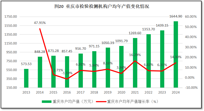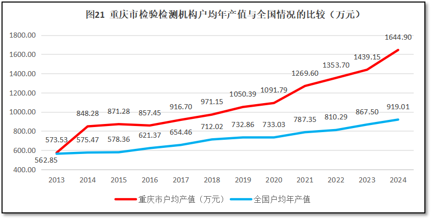 由图20可见,重庆市检验检测机构户均营收总体保持增长,2024年重庆市检验检测机构户均营收是2013年的2.87倍。从增长率的曲线来看,刨除第一年的异常数据,重庆市检验检测机构户均营收增长率在2021年增长幅度很大,其余年份也保持了较高增幅,从2014年至今的年均增速为6.96%,比同期全国的年均增速4.83%高出不少。