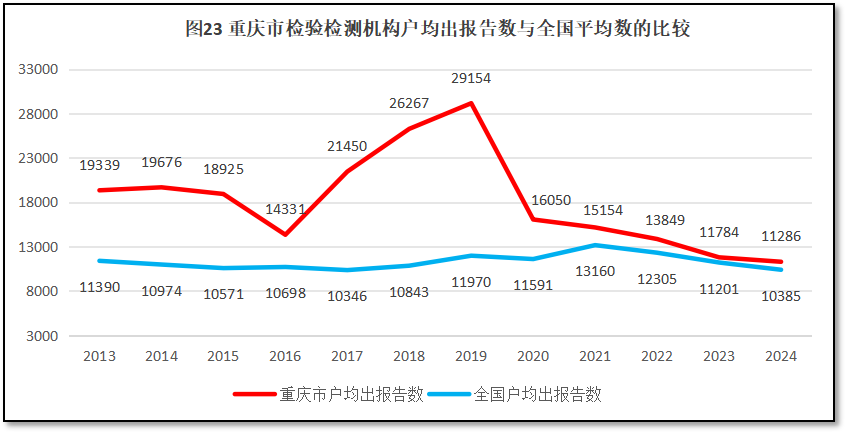 2024年度,重庆市检验检测机构户均出具检验检测报告11286份,十分接近全国平均水平10385份,全国排名第6位,与2023年度排名持平。从2013年以来,重庆市检验检测机构户均出具检验检测报告数量与全国的比较如图23所示。