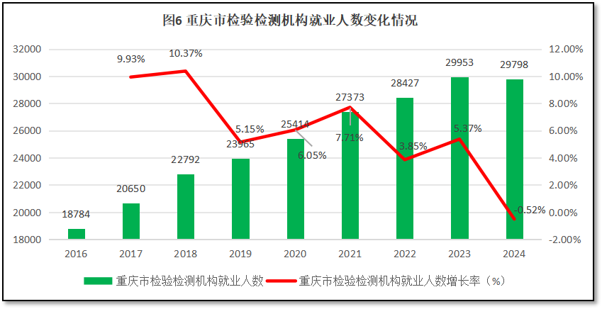 由图6可见,最近9年重庆市检验检测机构从业人员数量从2016年的1.88万人增长到2023年的2.99万人之后,2024年就业人数出现轻微下降,回落到2.98万人左右。从增长率曲线看,重庆市检验检测机构从业人数增长率总体是波动降低的走势,在2018年和2021年出现两个小的增长峰值,2023年又有所反弹,2024年出现-0.52%的增幅,也是过去9年来重庆首次出现负增长的情况。