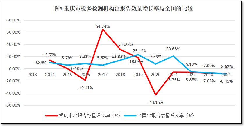 重庆市检验检测机构出具报告数量的增长率与全国检验检测机构出具报告增长率的比较如图9所示。
