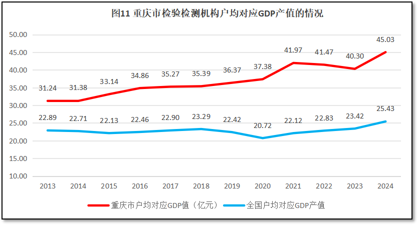 由图11可见,在2021年之前,重庆市检验检测机构户均对应的GDP值逐年增长,从2013年的31.24亿元增长到2021年的41.97亿元。此后略有下降,到2023年下降到40.30亿元。但2024年重庆市检验检测机构户均对应当地GDP值有较大反弹,达到了45.03亿元,是历年来的最高值。从重庆市户均对应GDP的值与全国情况进行比较可见,重庆市的数值一直远高于全国平均数,2024年的差距接近20亿元。重庆市的数据变化趋势表明,对应于当地快速增长的经济总量,重庆市现有的检验检测机构数量不多,因此检验检测行业发展空间巨大,市场容量可观,预期还会有很好的发展前景。